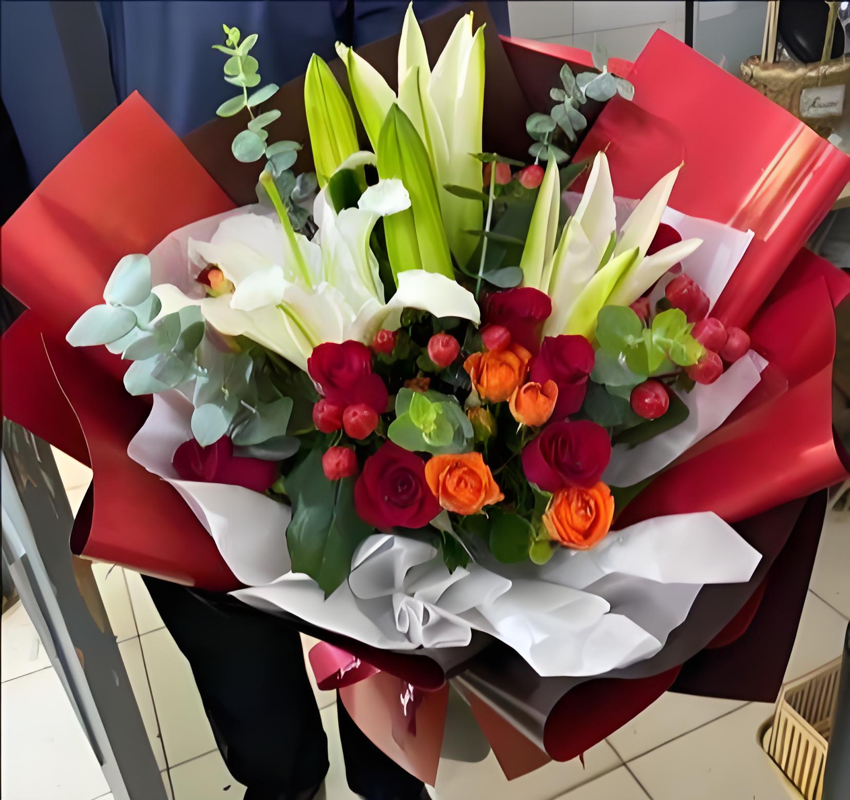 北海银海区花店包11枝红玫瑰、2枝多头白百合、6枝橙色多头玫瑰、红豆、尤加利叶